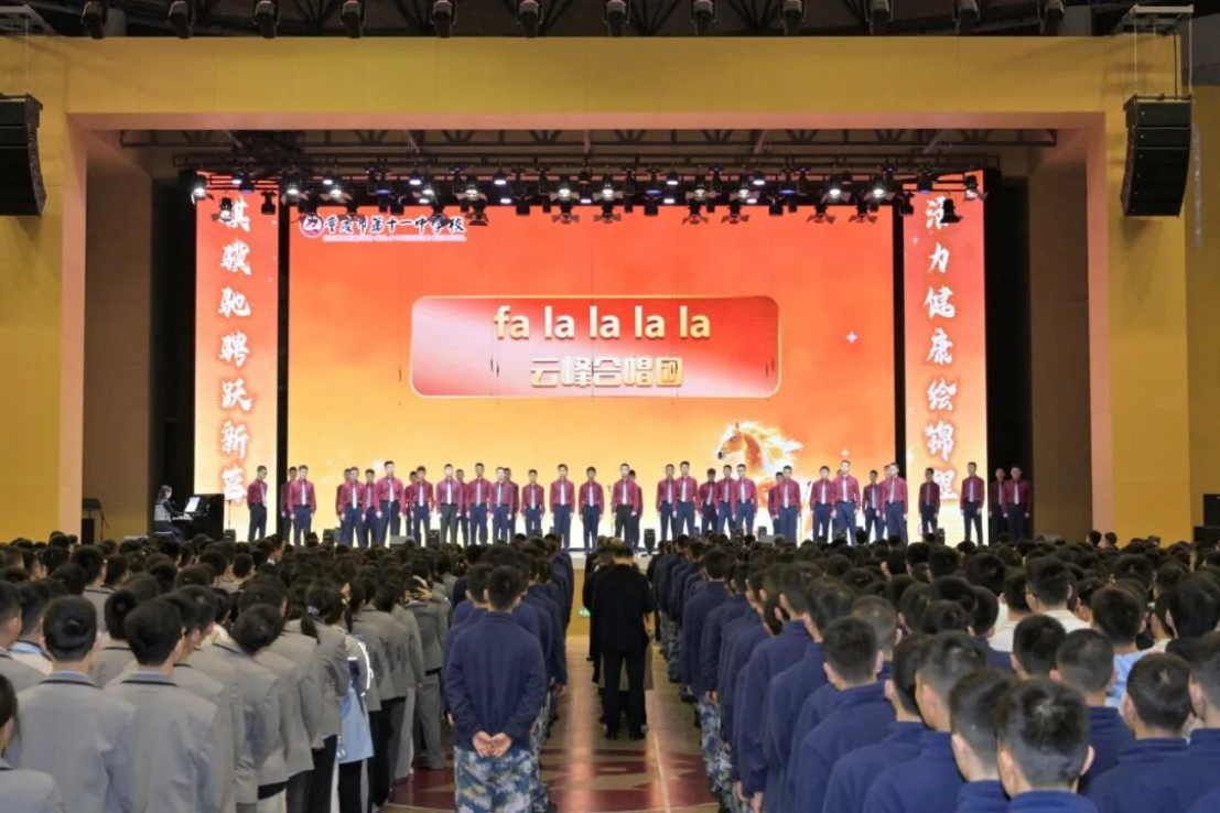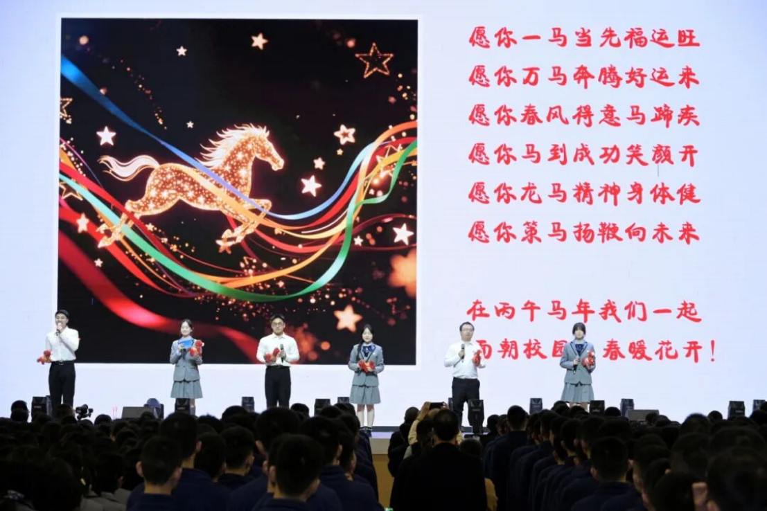 诗韵传情,共谱新篇。冉淋允、李萌、郭乘行三位老师与杨穆筱芸、耿钰锜、李雨辰三位同学联袂带来情景朗诵《马年组诗——骏马辞旧岁,活力谱新篇》。师生同心,声情并茂,时而低沉婉转,诉说初心与坚守;时而激昂高亢,传递奋进与力量。抑扬顿挫间,流淌出十一中人的家国情怀与逐梦决心,将典礼氛围推向高潮。